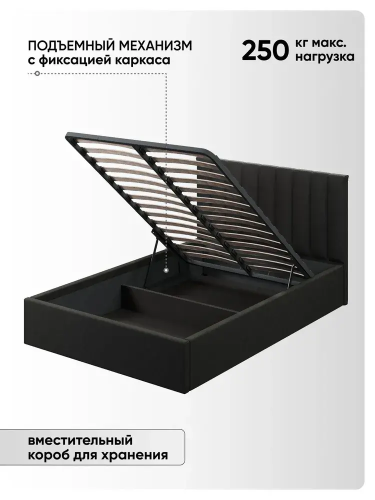 Ортопедическое основание с подъёмным механизмом и ламелями, изготовленные из экологически чистых пород древесины, выдерживают нагрузку до 125 кг. 10 летняя гарантия на металлическую рамку. Газлифты повышенной мощности позволяют поднимать и опускать ортопедическую рамку с матрасом без всяких усилий.
