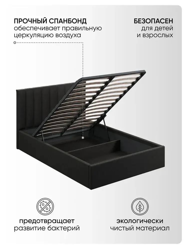 Подкроватное пространство закрыто противопыльным матерчатым коробом из плотного Спанбонда и служит для постельного белья и прочих принадлежностей. Спанбонд - это экологически чистый, 100% полипропиленовый нетканый материал, устойчив к сминанию и стиранию, устойчив к воздействию кислот и щелочей, имеет низкое водовпитывание, не гниёт и не плесневеет, что способствует его длительному использованию.