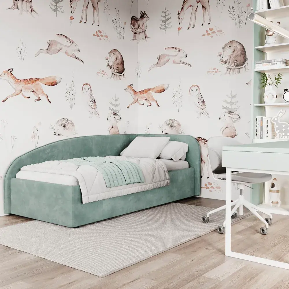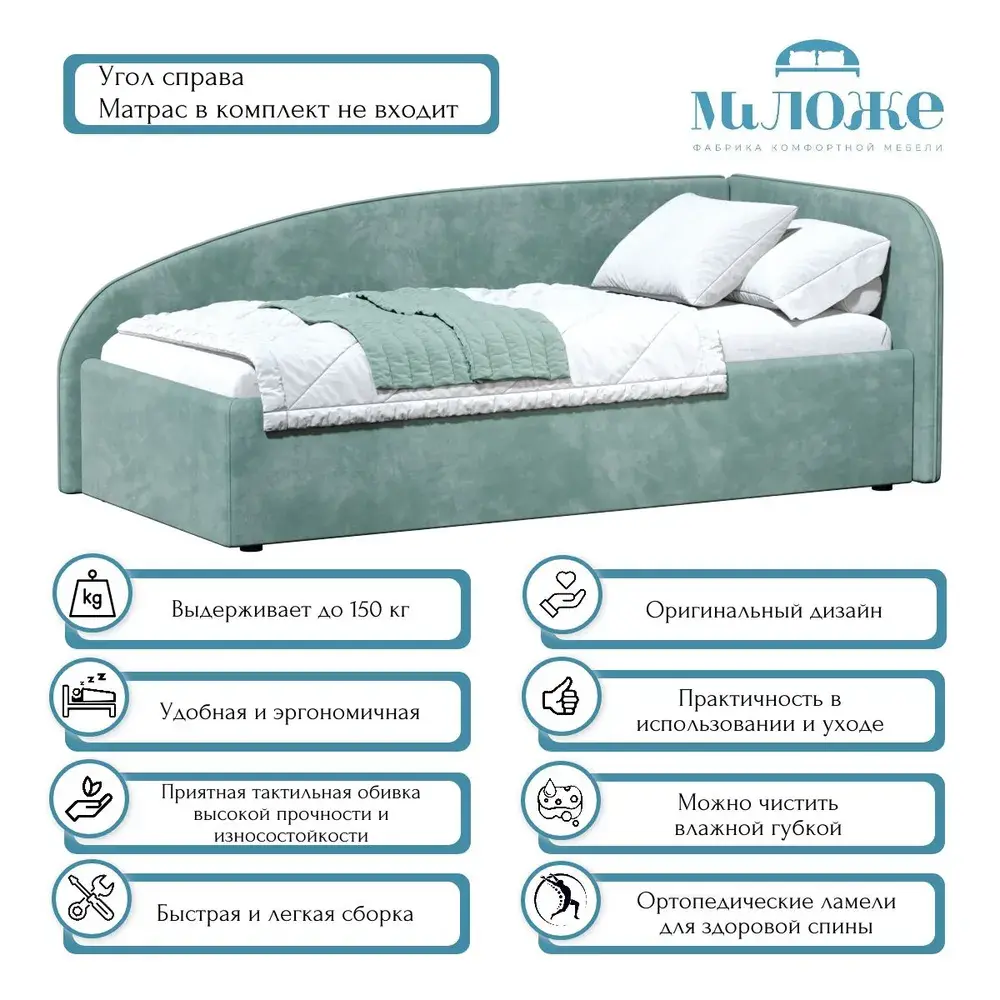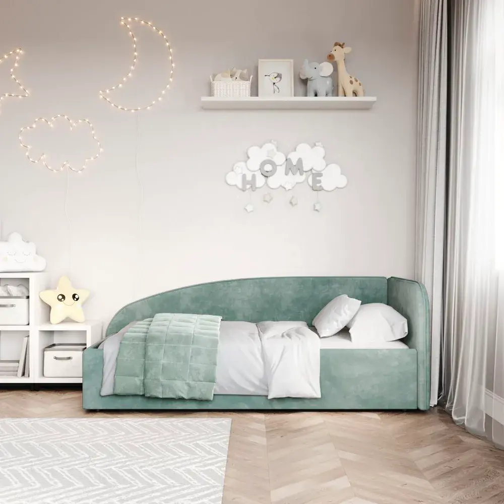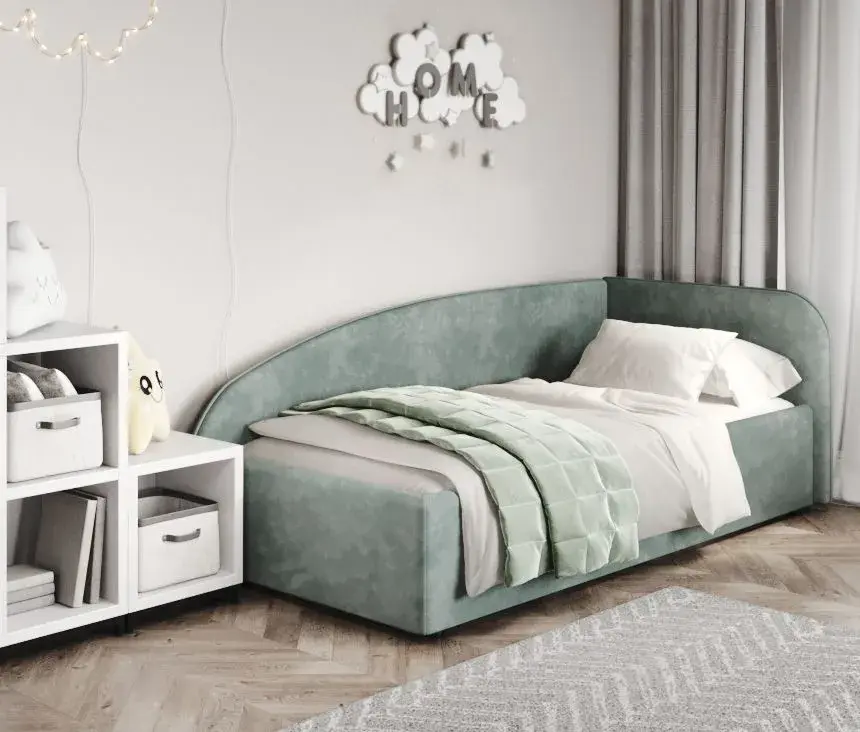 Конструкция кровати выполнена из качественных материалов, что гарантирует долговечность и надежность. Округлые линии не только визуально смягчают пространство, но и повышают безопасность, особенно если кровать используется в детской комнате. Мягкое изголовье из натуральных тканей (велюр премиум класса), создает дополнительный комфорт и уют. Подкроватное пространство закрыто противопыльным матерчатым коробом из плотного Спанбонда и служит для постельного белья и прочих принадлежностей. Спанбонд - это экологически чистый, 100% полипропиленовый нетканый материал, устойчив к сминанию и стиранию, устойчив к воздействию кислот и щелочей, имеет низкое водовпитывание, не гниёт и не плесневеет, что способствует его длительному использованию.