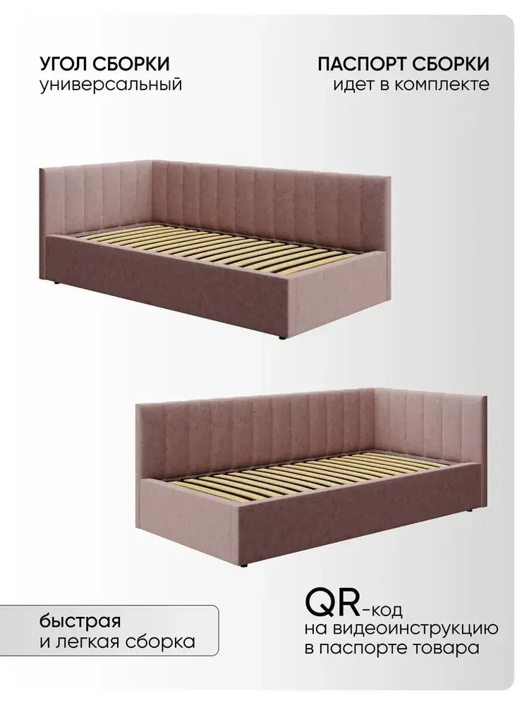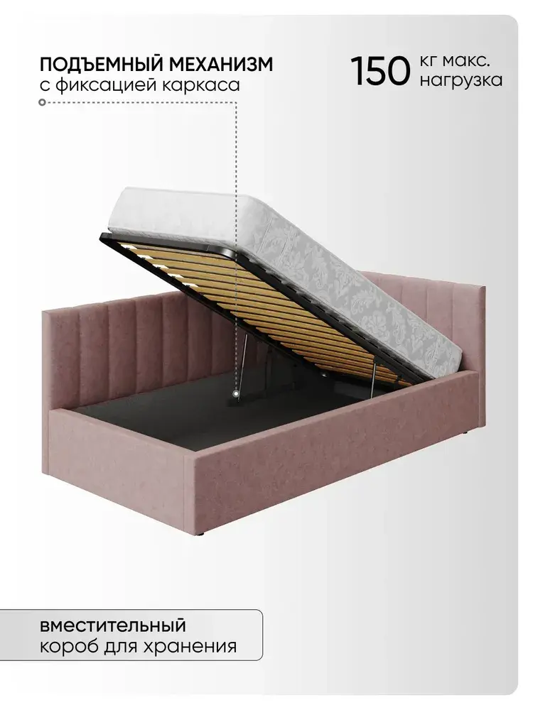 Внимание! Матрас в комплект не входит!Угловая мягкая односпальная Кровать Юлия правосторонней и левосторонней сборки из Велюра Премиум класса, ортопедическим основанием, с подъёмным механизмом, бельевым ящиком и спальным местом 90*200 см - удобное место для сна и отдыха, который совмещает в себе полноценную кровать и диван от фабрики комфортной мебели МиЛоже.При выборе мягкой мебели качественная обивка является одним из решающих факторов. Обивка из Велюра Премиум – это очень привлекательная, тактильно приятная ткань с характерными переливами, мягкая и бархатистая на ощупь, отсутствие пальчикового эффекта, высокой прочности и износостойкости, гипоалллергенный, простота в уходе. Декоративная прострочка на нём выглядит эстетично и выгодно подчёркивает стиль кровати.Ортопедическое основание с подъёмным механизмом и ламелями, изготовленные из экологически чистых пород древесины, выдерживают нагрузку до 150 кг. 10 летняя гарантия на металлическую рамку. Газлифты повышенной мощности позволяют поднимать и опускать ортопедическую рамку с матрасом без всяких усилий.Подкроватное пространство закрыто противопыльным матерчатым коробом из плотного Спанбонда и служит для постельного белья и прочих принадлежностей. Спанбонд - это экологически чистый, 100% полипропиленовый нетканый материал, устойчив к сминанию и стиранию, устойчив к воздействию кислот и щелочей, имеет низкое водовпитывание, не гниёт и не плесневеет, что способствует его длительному использованию.Надежная жёсткость всей конструкции гарантирует прочность при любых "режимах" эксплуатации.Особенность данной модели – это объёмные и мягкие царги, изножье и спинки, которые становятся гармоничным завершением образа и создают ещё больше уюта.Все наши изделия - это ручная работа мастеров. Фабрика комфортной мебели МиЛоже – это собственное производство, качество, надёжность, функциональность и долговечность изделия. Производство основано на сокращении себестоимости, без потерь в качестве, что позволяет нам поддерживать привлекательный уровень цен, проводить специальные акции и предлагать выгодные скидки. В нашей команде работают квалифицированные специалисты в области производства, их богатый опыт и чёткая организация рабочих процессов позволяют нам обеспечить высокое качество мебели.
