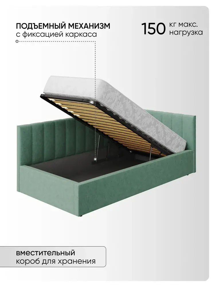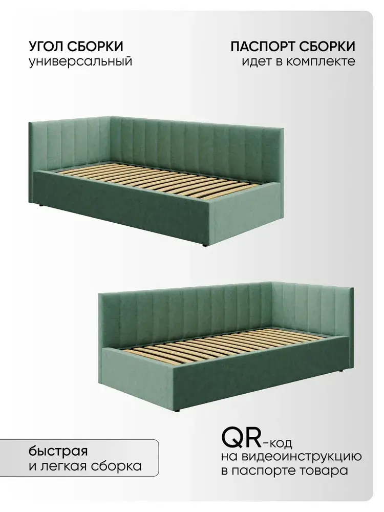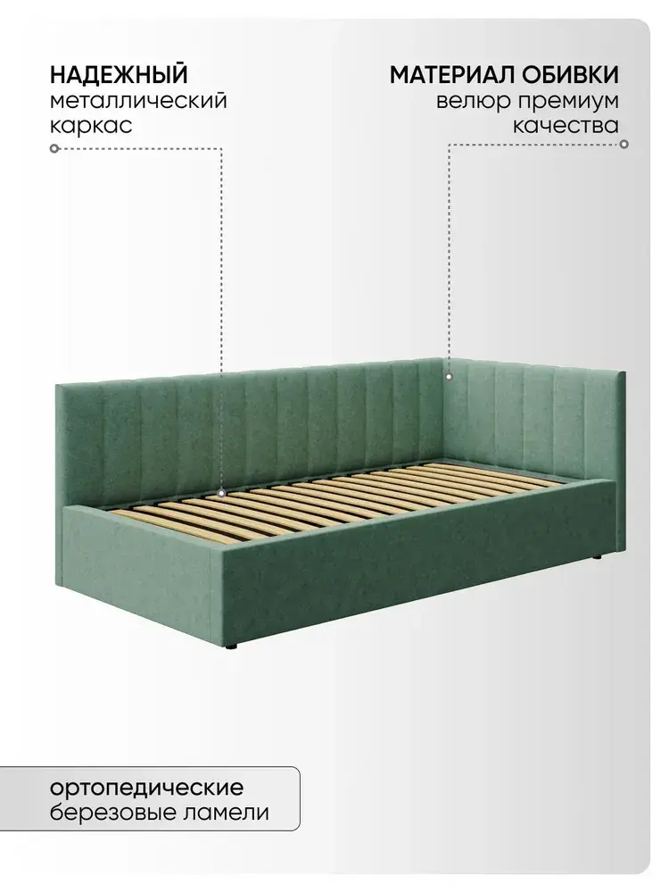 Угловая мягкая односпальная Кровать Юлия правосторонней и левосторонней сборки из Велюра Премиум класса, ортопедическим основанием, с подъёмным механизмом, бельевым ящиком и спальным местом 90*200 см - удобное место для сна и отдыха, который совмещает в себе полноценную кровать и диван от фабрики комфортной мебели МиЛоже.При выборе мягкой мебели качественная обивка является одним из решающих факторов. Обивка из Велюра Премиум – это очень привлекательная, тактильно приятная ткань с характерными переливами, мягкая и бархатистая на ощупь, отсутствие пальчикового эффекта, высокой прочности и износостойкости, гипоалллергенный, простота в уходе. Декоративная прострочка на нём выглядит эстетично и выгодно подчёркивает стиль кровати.Ортопедическое основание с подъёмным механизмом и ламелями, изготовленные из экологически чистых пород древесины, выдерживают нагрузку до 150 кг. 10 летняя гарантия на металлическую рамку. Газлифты повышенной мощности позволяют поднимать и опускать ортопедическую рамку с матрасом без всяких усилий.Подкроватное пространство закрыто противопыльным матерчатым коробом из плотного Спанбонда и служит для постельного белья и прочих принадлежностей. Спанбонд - это экологически чистый, 100% полипропиленовый нетканый материал, устойчив к сминанию и стиранию, устойчив к воздействию кислот и щелочей, имеет низкое водовпитывание, не гниёт и не плесневеет, что способствует его длительному использованию.Надежная жёсткость всей конструкции гарантирует прочность при любых "режимах" эксплуатации.Особенность данной модели – это объёмные и мягкие царги, изножье и спинки, которые становятся гармоничным завершением образа и создают ещё больше уюта.Все наши изделия - это ручная работа мастеров. Фабрика комфортной мебели МиЛоже – это собственное производство, качество, надёжность, функциональность и долговечность изделия. Производство основано на сокращении себестоимости, без потерь в качестве, что позволяет нам поддерживать привлекательный уровень цен, проводить специальные акции и предлагать выгодные скидки. В нашей команде работают квалифицированные специалисты в области производства, их богатый опыт и чёткая организация рабочих процессов позволяют нам обеспечить высокое качество мебели.