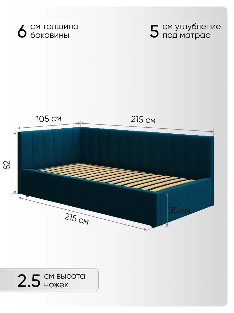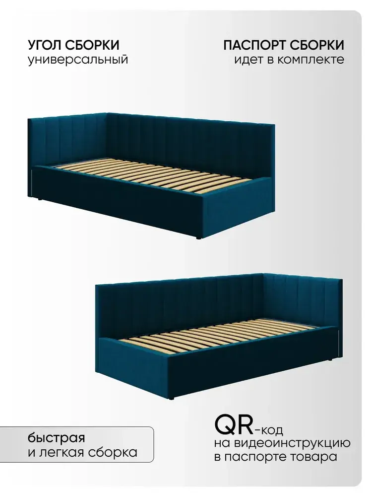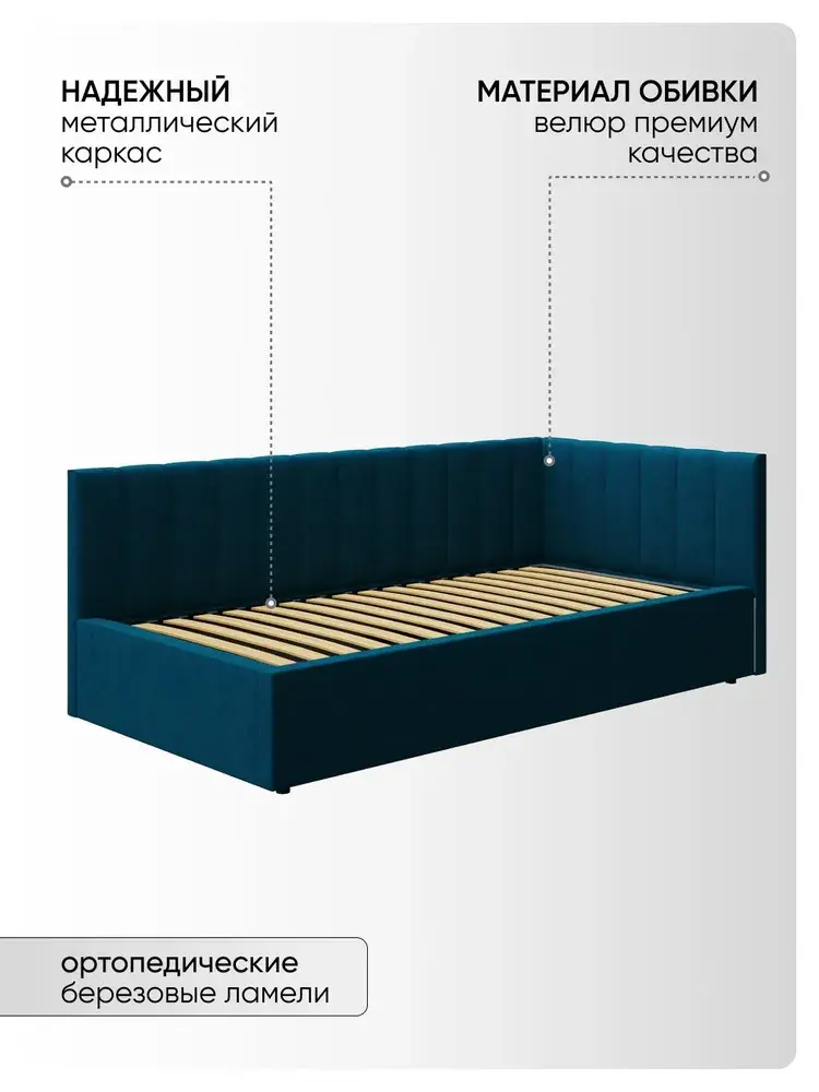 Угловая мягкая односпальная Кровать Юлия правосторонней и левосторонней сборки из Велюра Премиум класса, ортопедическим основанием, с подъёмным механизмом, бельевым ящиком и спальным местом 90*200 см - удобное место для сна и отдыха, который совмещает в себе полноценную кровать и диван от фабрики комфортной мебели МиЛоже.При выборе мягкой мебели качественная обивка является одним из решающих факторов. Обивка из Велюра Премиум – это очень привлекательная, тактильно приятная ткань с характерными переливами, мягкая и бархатистая на ощупь, отсутствие пальчикового эффекта, высокой прочности и износостойкости, гипоалллергенный, простота в уходе. Декоративная прострочка на нём выглядит эстетично и выгодно подчёркивает стиль кровати.Ортопедическое основание с подъёмным механизмом и ламелями, изготовленные из экологически чистых пород древесины, выдерживают нагрузку до 150 кг. 10 летняя гарантия на металлическую рамку. Газлифты повышенной мощности позволяют поднимать и опускать ортопедическую рамку с матрасом без всяких усилий.Подкроватное пространство закрыто противопыльным матерчатым коробом из плотного Спанбонда и служит для постельного белья и прочих принадлежностей. Спанбонд - это экологически чистый, 100% полипропиленовый нетканый материал, устойчив к сминанию и стиранию, устойчив к воздействию кислот и щелочей, имеет низкое водовпитывание, не гниёт и не плесневеет, что способствует его длительному использованию.Надежная жёсткость всей конструкции гарантирует прочность при любых "режимах" эксплуатации.Особенность данной модели – это объёмные и мягкие царги, изножье и спинки, которые становятся гармоничным завершением образа и создают ещё больше уюта.Все наши изделия - это ручная работа мастеров. Фабрика комфортной мебели МиЛоже – это собственное производство, качество, надёжность, функциональность и долговечность изделия. Производство основано на сокращении себестоимости, без потерь в качестве, что позволяет нам поддерживать привлекательный уровень цен, проводить специальные акции и предлагать выгодные скидки. В нашей команде работают квалифицированные специалисты в области производства, их богатый опыт и чёткая организация рабочих процессов позволяют нам обеспечить высокое качество мебели.