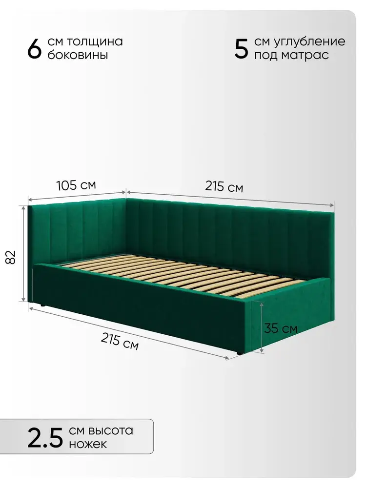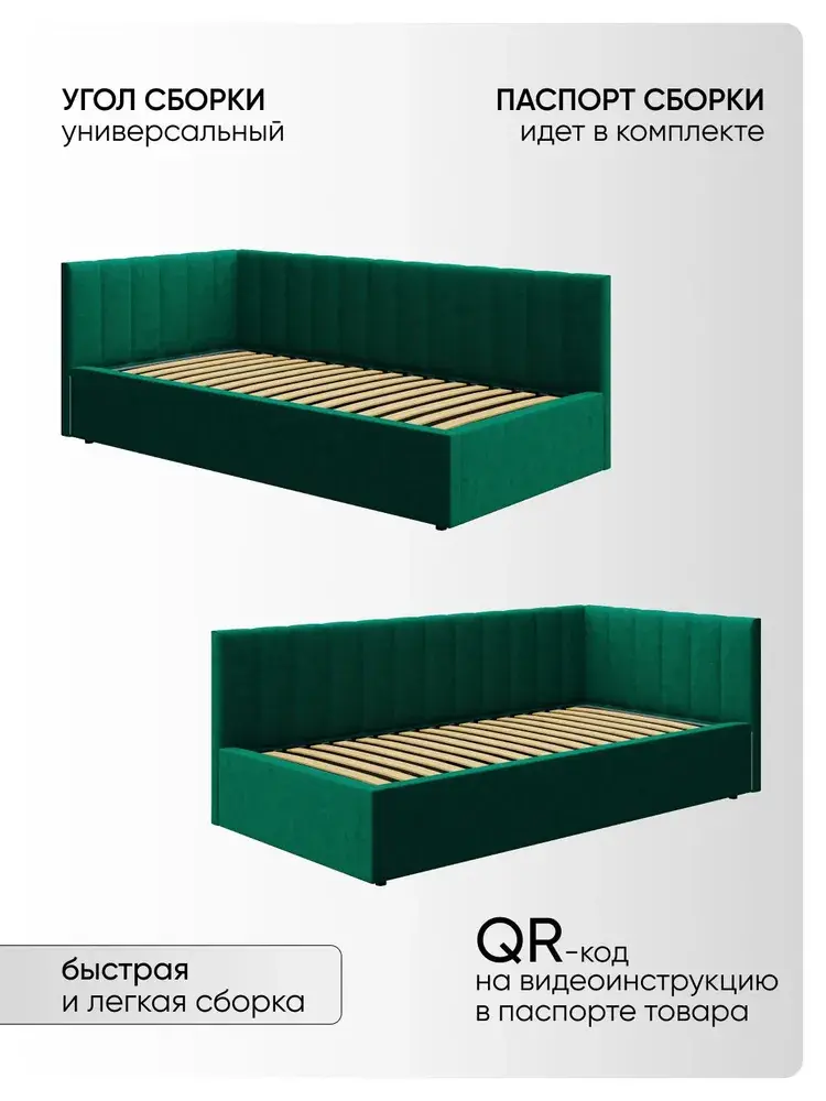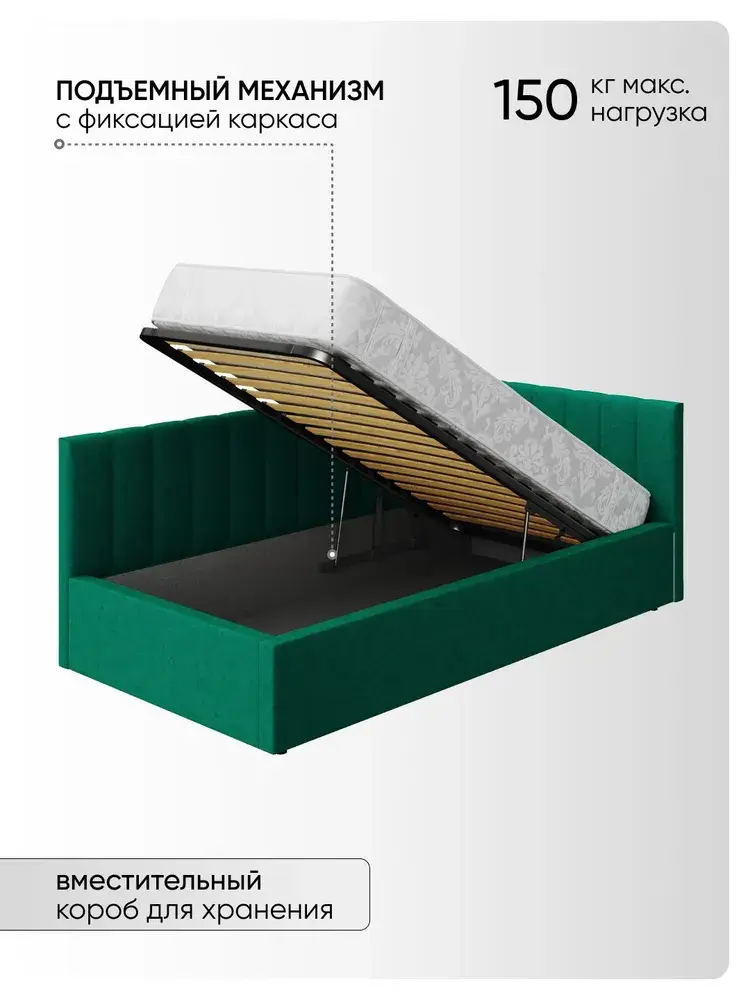 Угловая мягкая односпальная Кровать Юлия правосторонней и левосторонней сборки из Велюра Премиум класса, ортопедическим основанием, с подъёмным механизмом, бельевым ящиком и спальным местом 90*200 см - удобное место для сна и отдыха, который совмещает в себе полноценную кровать и диван от фабрики комфортной мебели МиЛоже.При выборе мягкой мебели качественная обивка является одним из решающих факторов. Обивка из Велюра Премиум – это очень привлекательная, тактильно приятная ткань с характерными переливами, мягкая и бархатистая на ощупь, отсутствие пальчикового эффекта, высокой прочности и износостойкости, гипоалллергенный, простота в уходе. Декоративная прострочка на нём выглядит эстетично и выгодно подчёркивает стиль кровати.Ортопедическое основание с подъёмным механизмом и ламелями, изготовленные из экологически чистых пород древесины, выдерживают нагрузку до 150 кг. 10 летняя гарантия на металлическую рамку. Газлифты повышенной мощности позволяют поднимать и опускать ортопедическую рамку с матрасом без всяких усилий.Подкроватное пространство закрыто противопыльным матерчатым коробом из плотного Спанбонда и служит для постельного белья и прочих принадлежностей. Спанбонд - это экологически чистый, 100% полипропиленовый нетканый материал, устойчив к сминанию и стиранию, устойчив к воздействию кислот и щелочей, имеет низкое водовпитывание, не гниёт и не плесневеет, что способствует его длительному использованию.Надежная жёсткость всей конструкции гарантирует прочность при любых "режимах" эксплуатации.Особенность данной модели – это объёмные и мягкие царги, изножье и спинки, которые становятся гармоничным завершением образа и создают ещё больше уюта.Все наши изделия - это ручная работа мастеров. Фабрика комфортной мебели МиЛоже – это собственное производство, качество, надёжность, функциональность и долговечность изделия. Производство основано на сокращении себестоимости, без потерь в качестве, что позволяет нам поддерживать привлекательный уровень цен, проводить специальные акции и предлагать выгодные скидки. В нашей команде работают квалифицированные специалисты в области производства, их богатый опыт и чёткая организация рабочих процессов позволяют нам обеспечить высокое качество мебели.