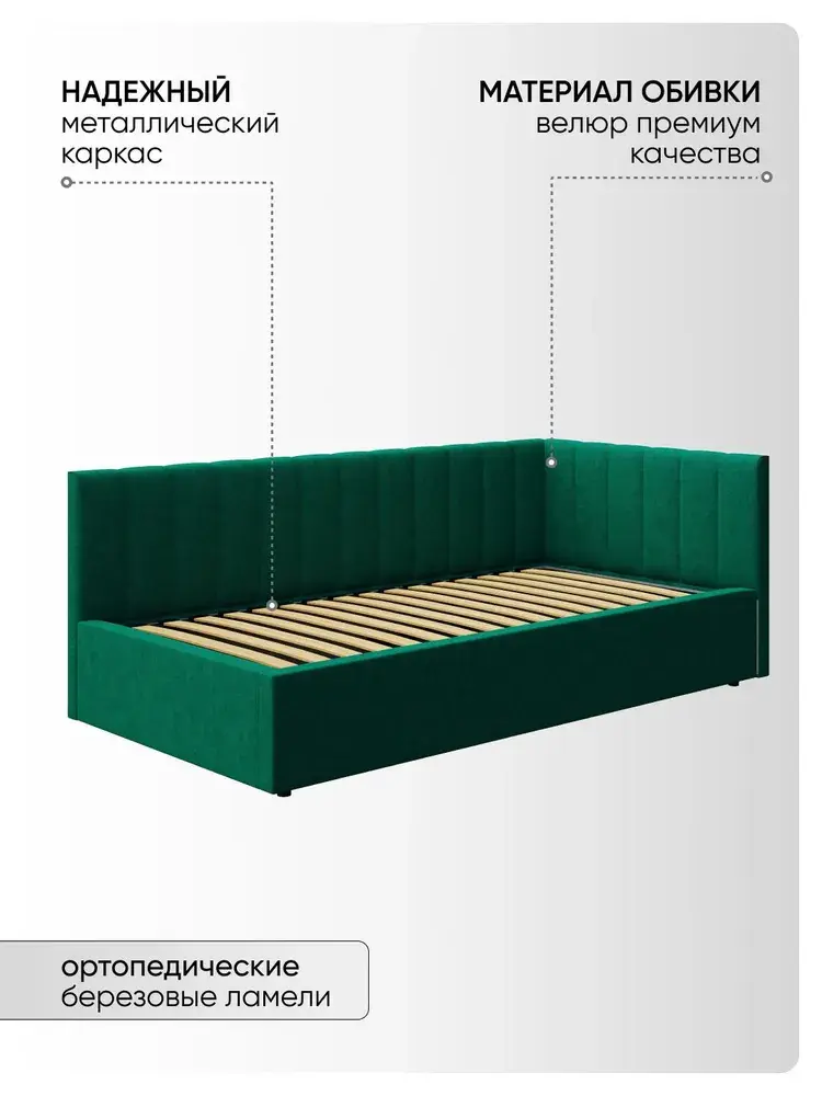Односпальная угловая кровать 90х200 "Юлия" Зеленый-Велюр